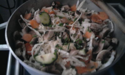 Corte cenoura, cogumelos frescos, courgette, feijão verde, couve branca (fechada), use rebentos de soja, enfim, o que tiver em casa e mais gostar.Deite dentro do tacho com